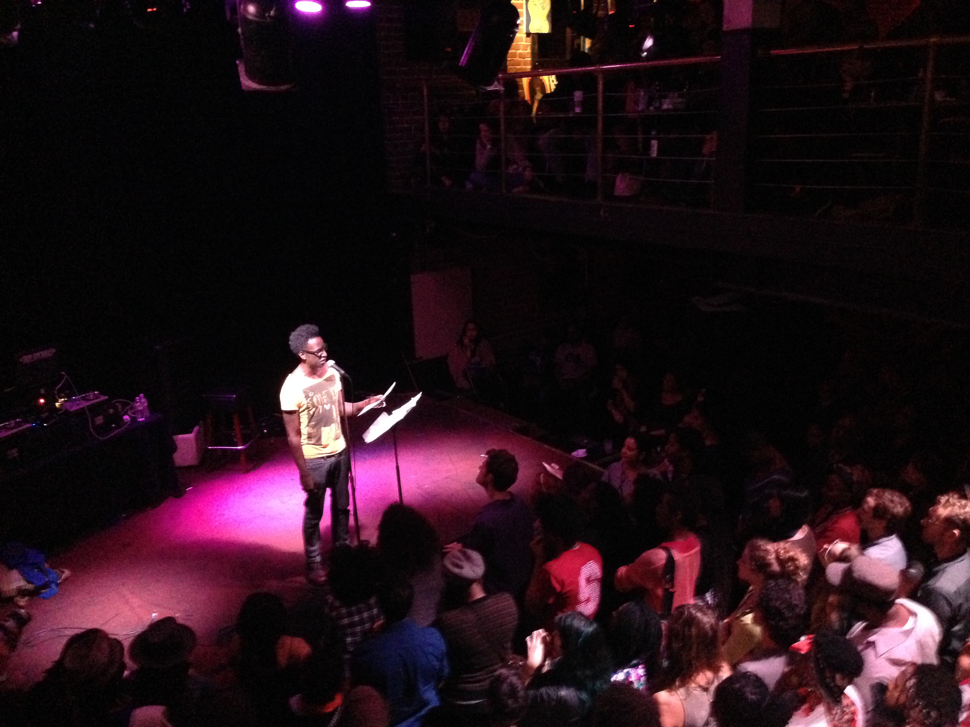 Saul had been performing music for a while, and I thought the night would include his band, but I was wrong. The stage was set with a dj and some mics. This would be a superstar reading– akin to Bukowski or Beat readings from decades ago where it was just One Name reading to a packed room of dedicated followers. I was naturally one of the first to arrive, found a seat above the stage on the balcony. By the time the show got underway, the main floor beneath me was packed as a bag of marbles. The show that occurred was powerful in ways I’m not sure I can articulate.