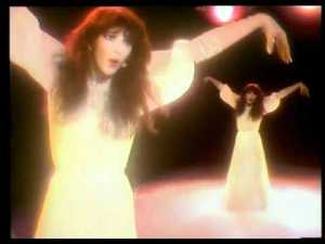 Fade up on a woman in double image, rising from an arc of rainbow light. A piano begins like misting rain, as if its being gently tickled as opposed to played. The woman on screen wears a white dress, not as a ghost or angel even but more like a muse, a low end goddess who shyly demurs too much fuss or attention. Her hair is long and dark, hanging over her shoulders. She mimes, she gestures before a black background. Unlike the other videos I’d seen, this is without groupies, dancers, a band, or a set. The director doesn’t even mix crazy colors into the unused background. Its just her dancing alone, video effects echoing her movements so that her body smears across the screen and she appears to dance duet with herself. This video cost less than $20 to make and I was riveted.