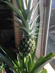 I read a pineapple plant will produce one fruit, then die. It was so old and huge and awkward despite the leaves cut back, I felt ready to replace it and determine to do better next time. The remaining plant was thick and long as a spinal cord. As if in ceremony, I took it to the compost bin and turned the pot over. I struggled several minutes to release it.