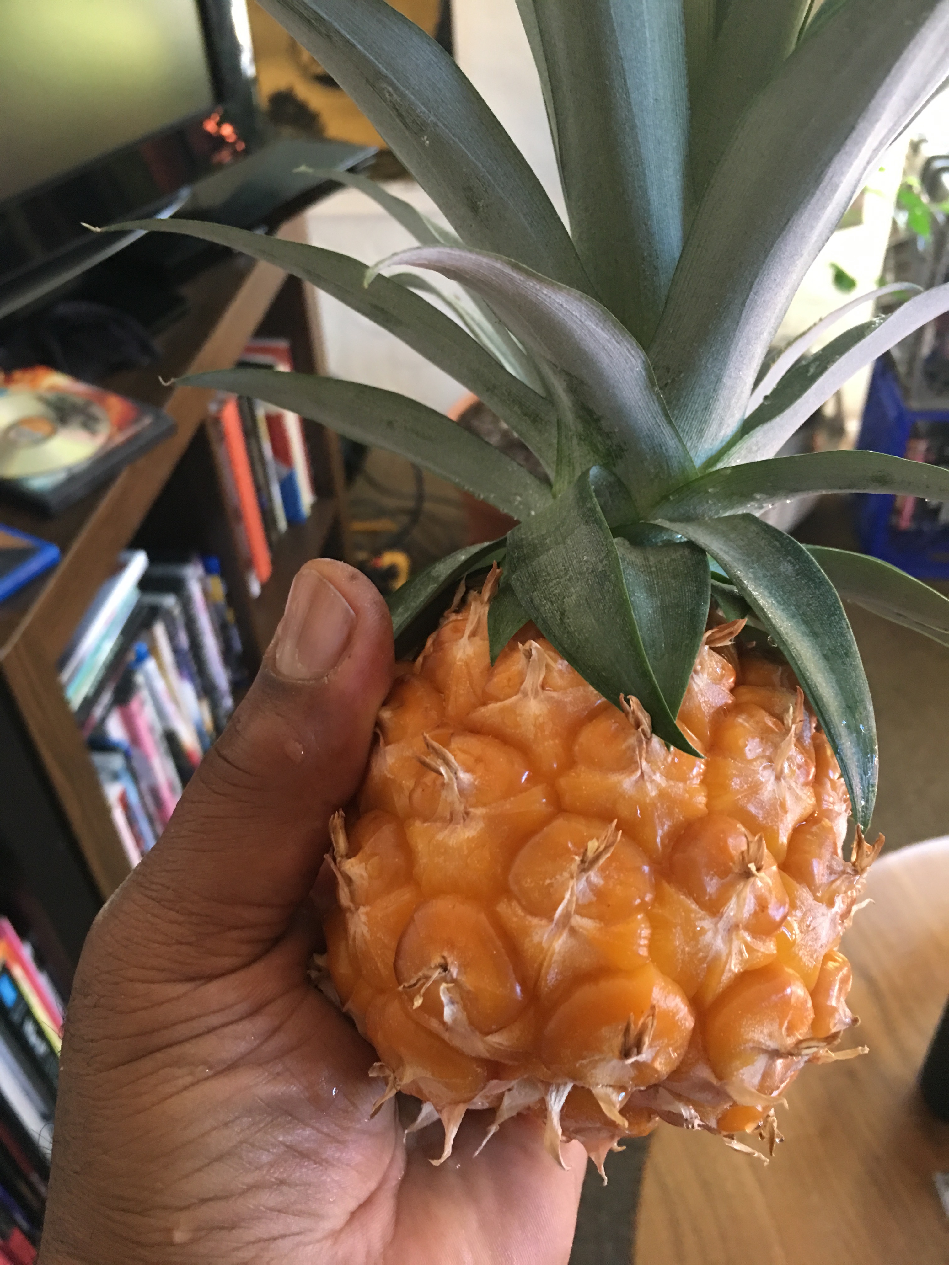 The pineapple has been deleted from history. It just appeared spontaneously, without evolutionary explanation or UFO sighting. There’s no reference in the bible, — on the seventh day God did not indulge in a pineapple smoothie, apparently. There’s no reference to whether it sat with the water and wine in the wedding Jesus attended, neither was it provided nor banned during any feast. It is not in the Odyssey or Iliad, was not drooled over by King Louis and neither did Shakespeare, inventor of dozens of words, ever assume to create the simple compound poetry of pine-apple, nor placing it on the wandering tongue of even his most mad monologists. In fact, if I shared here a factoid that the first dinosaurs were killed not by asteroid, but by a mis-identified, falling pineapple, you couldn’t completely disprove it. You don’t realize how heavy that damn thing is.