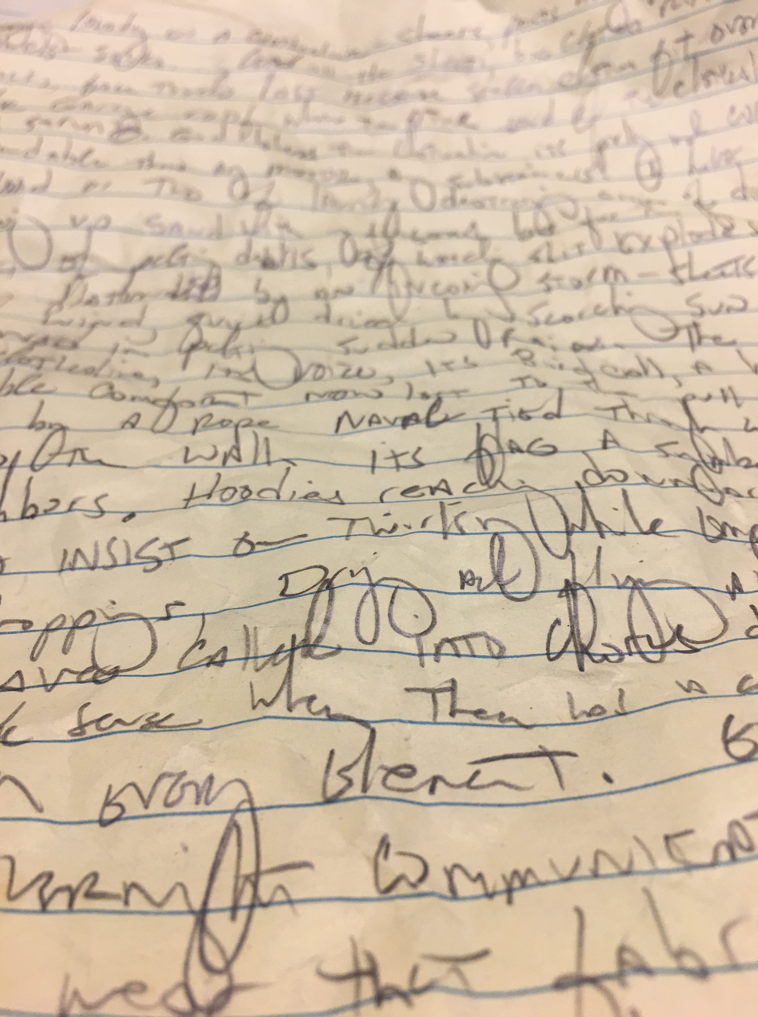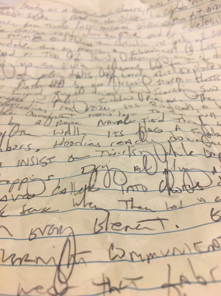 I wrote two pages and stopped. then 2-3 days later, typed them at work. Two days after that, I printed my notes and hand wrote those notes again, this time attempting to arrange a specific order for lines and stanzas. I hand wrote because I wanted to really look back and remember as much as I could. I hand wrote them because I wanted to feel the words I was choosing. My fingers are like jackhammers on a keyboard. I need to slow down and feel the language. So, where do I start, what’s important to me, what must I say?