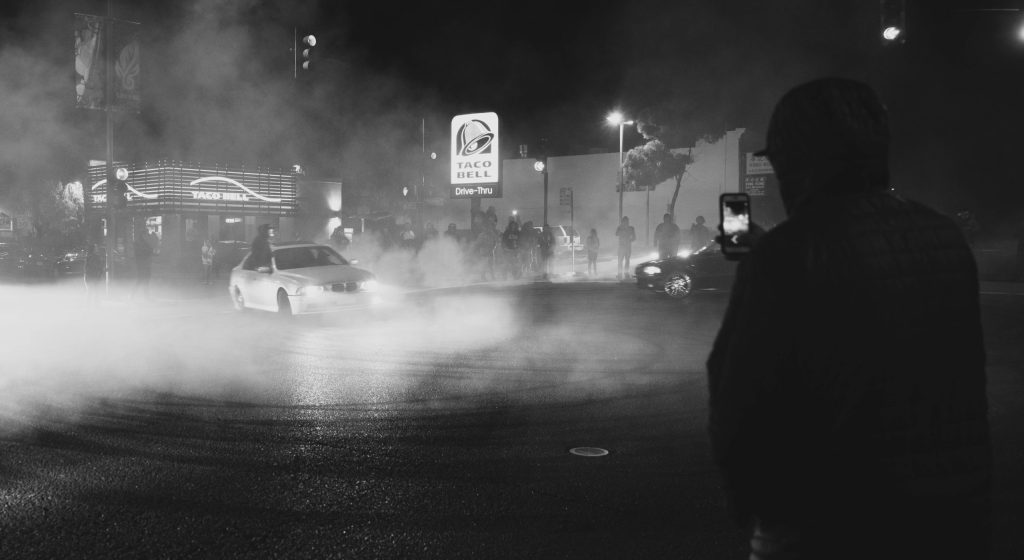 I’ve long wondered how sideshows are organized. Incestual group chats, private messengers and alerts between drivers. But this was a holiday weekend and one would think events like this just happen and snowball. Homies text homies and superhighways of rowdy gossip and promises get paved until there is car after car of licensed children, roaming wild through the long night. This generations’ wave of rebellion is to parade the streets in fleets of cars with no specific destination. Or a secret destination collectively known or discovered, only to end up at an intersection large enough to unfurl a cloak of burned rubber smoke.