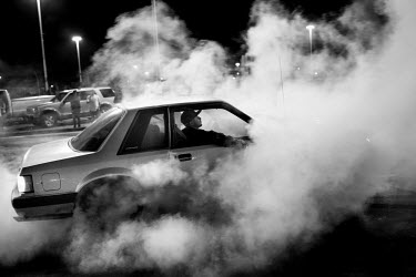 Sideshows are cars performing freestyle dance. More rhumba and pirouette than a parked low rider hitting hydraulic switches to make their caddy twerk and boogaloo. Despite the price of gas, this is certainly cheaper than a club that offers music — a pitiful one track at a time, as opposed to the stack of Toyotas and Fords each boasting different beats. More entertaining than standing at the bar sipping overpriced drinks. The cars migrate from enclave to town to city, searching like a dog for a place to turn around and kick up great castellated clouds of ignited rubber and scuffed gravel.