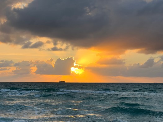 Each morning, I rose an hour before sunrise and walked to the beach. Of the varieties of people in the world, there are those who line up at ocean’s edge for the sunrise or the sunset. Over the past year or so, I’ve enjoyed writing mornings in an office conference room while the sun mounted the sky outside. So in Miami, I became a regular worshipper with the guests of the ocean at daybreak. At the shoreline there were regulars I always saw: the man with the chihuahua who slept overnights in the warm sand; men collecting trash in huge clear sacks, beach combing trucks sifting the sandy topsoil, unrelated men wiuth matching metal detectors, then chains of birds– plovers, pelicans, then gulls–all seeming to appear at the same time each morning as if a class just let out. We were the only consistent thing. Poet Richard Blanco pointed out the ocean is different everyday. So first day the wind throttled up and rattled the palm trees. The next the ocean appeared flat as if ironed and looked walkable without need for holiness. The next it rained and the wind was furious combing the beach before the shift of trucks arrived and throwing waves like sheets for a huge bed. At the horizon line, different routes of cargo ships and varied recipes of fog. I walked for exercise infrequently since it was so humid and the first morning walk I took I looked at if I’d been swimming. Not that anyone noticed or cared. Wishing I had the knees to run but felt content that I didn’t. Afterwards, I’d return to the hotel for breakfast then finally settle in the library or lobby and write for as long as I wanted, for as long as the words compelled me. Then I’d curl up in bed with wifi reception that made me blush with envy, angry over the service I paid for at home– service they dared charge extra for if I was ever paid late, whether I felt bitter over outages or not.