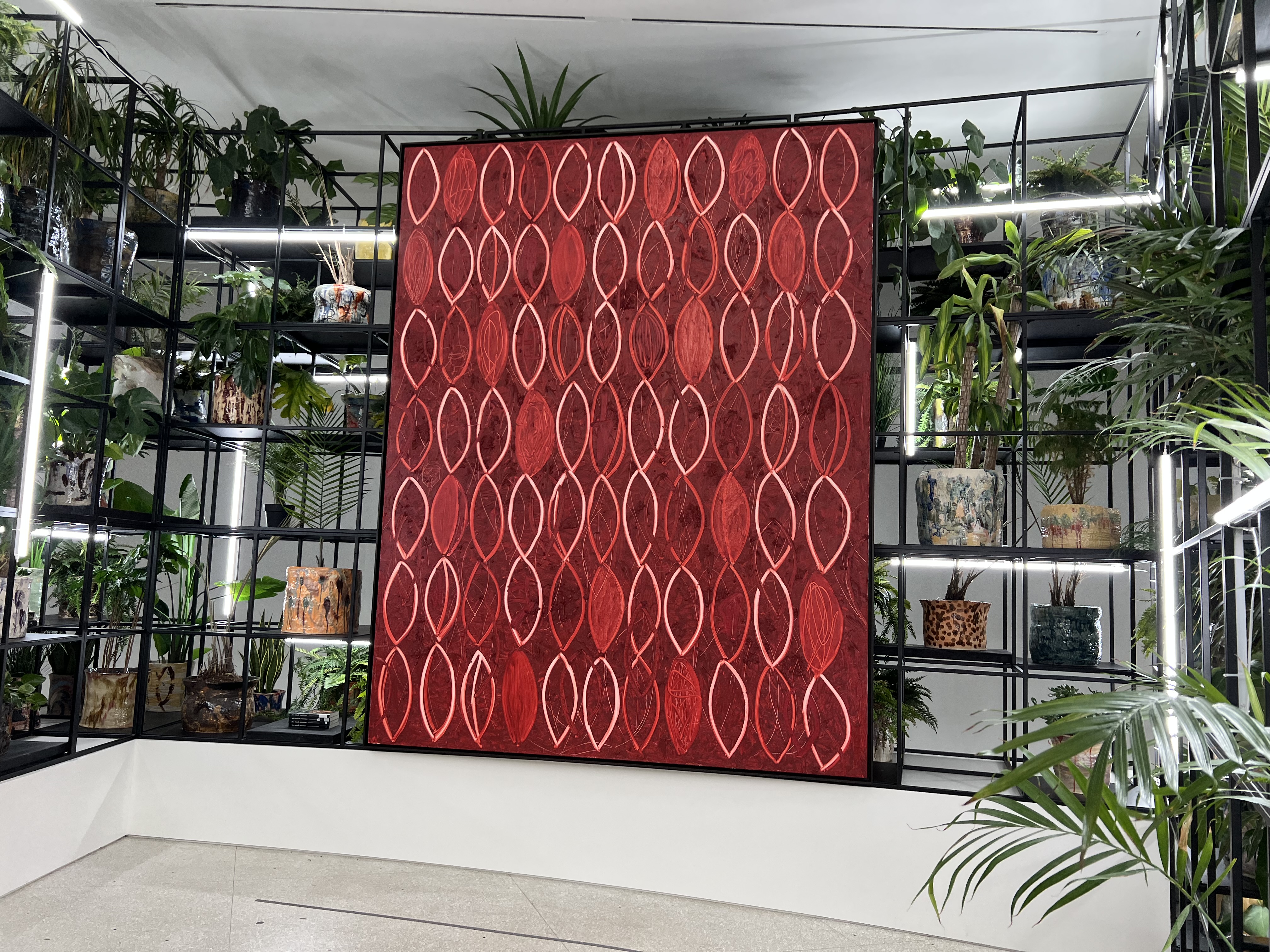 Johnson was very much a living presence within the gallery because the work created an electrical response within guests. Upon entering, one is first compelled to look up at the Guggenheim skylight where dozens of potted plants hover suspended above, a configuration of trapeze aerialists. There thrives an anxious pulse in Johnson’s work that makes one feel as if they’re interacting with an entity instead of the creative impulses of an artist. Due in part to the presence of growing plants, softening shea butter, his work appears to breathe, grow, change while you experience it. Johnson is a thrilling, powerful artist.